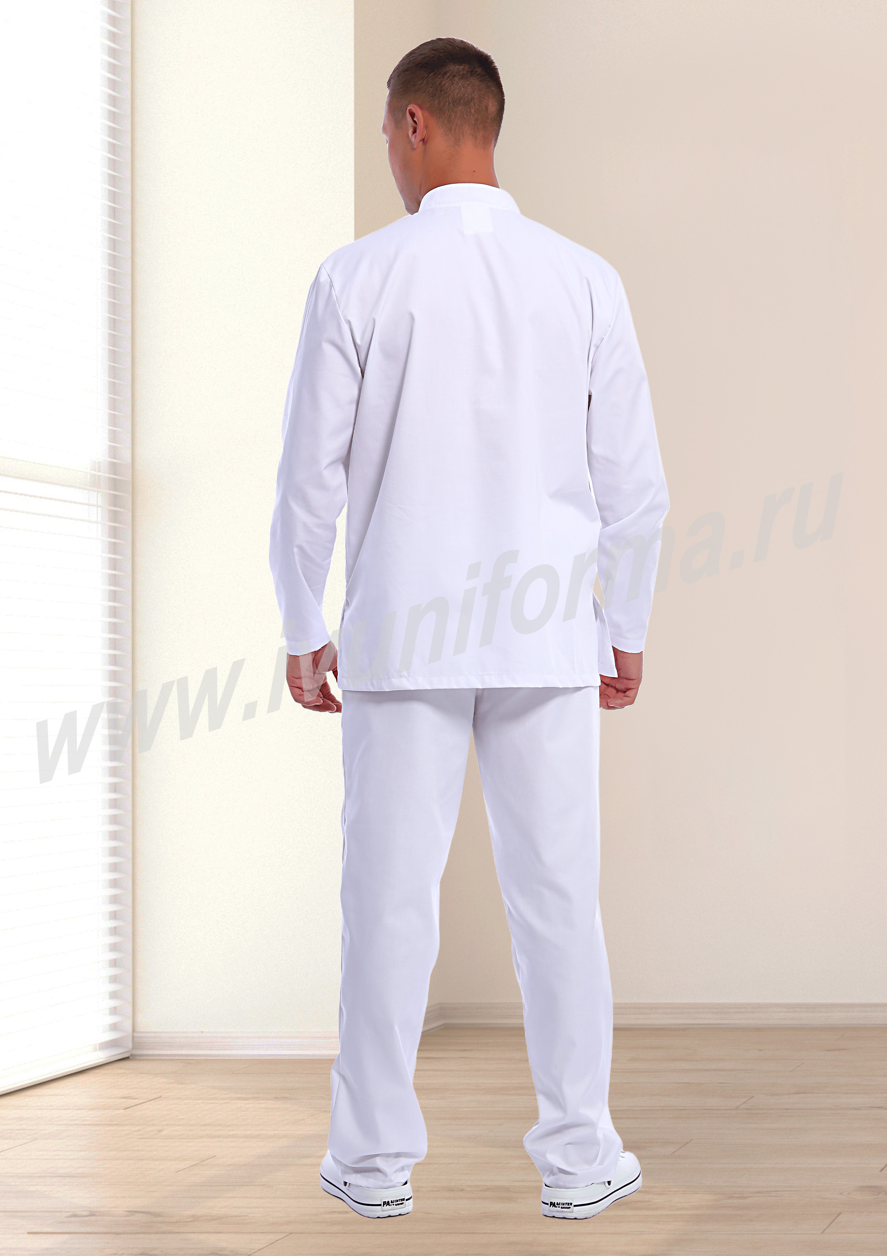 Костюм мужской состоит из куртки и брюк. Куртка удлиненная прямого силуэта с центральной потайной застежкой на две кнопки. Полочка с отрезными кокетками, спинка прямая. Рукав втачной длинный, прилегание рукава по низу регулируется кнопками. Воротник-стойка с потайной застежкой на кнопку обеспечивает изоляцию кожных покровов в области шеи. В боковых швах куртки предусмотрены разрезы для легкого доступа в карманы брюк. Брюки прямые на эластичном поясе со вставкой для комфортной посадки на талии и верхними боковыми карманами с наклонным входом. Костюм предназначен для защиты от общих производственных загрязнений. Модель разработана в соответствии с международными требованиями безопасности пищевого производства согласно системе НАССР (ХАССП).